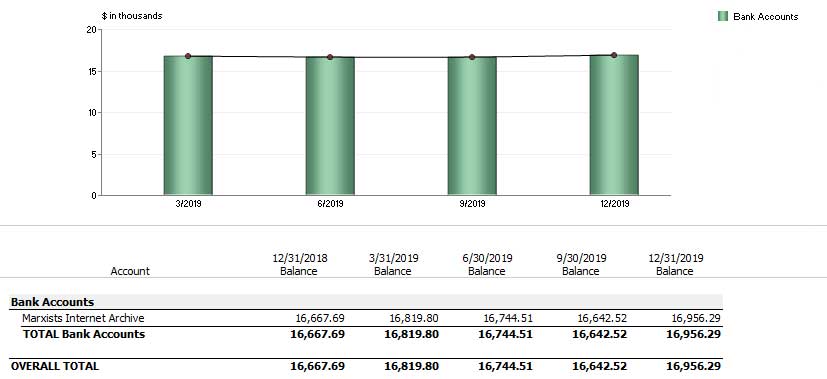 We started 2019 with US$16,667.69 in the bank. For the first three quarters of the year, our average quartely balance was US$16,790.78. Our year-end bank balance was US$16,956.19.