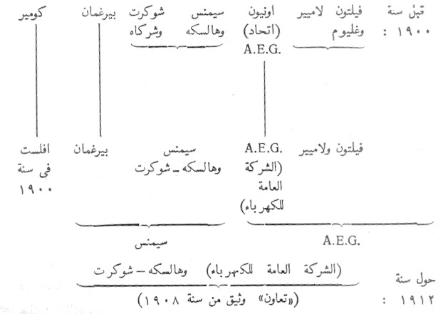 إن الشركة الشهيرة (AEG) (الشركة العامة للكهرباء) التي تضخمت على هذا الشكل، تهيمن على 175-200 شركة (على أساس نظام « الإشتراك ») وتتصرف برأسمال مجموعة يقرب من 1.5 مليار مارك. في أكثر من 10 دول. ومنذ سنة 1904 كانت الرساميل التي وظفتها الصناعة الكهربائية الألمانية في الخارج تقدر بـ 233 مليون مارك منها 62 مليونا في روسيا. وغني عن القول أن « الشركة العامة للكهرباء » هي عبارة عن مشروع هائل « مركب » – شركاته الصناعية وحدها تبلغ 16 – وتنتج مختلف أصناف المنتوجات من الأسلاك والعازلات حتىالسيارات والطائرات. ولكن التمركز في أوروبا كان كذلك جزءا لا يتجزأ من مجرى التمركز في أمريكا. وهاكم كيف تم هذا السير: