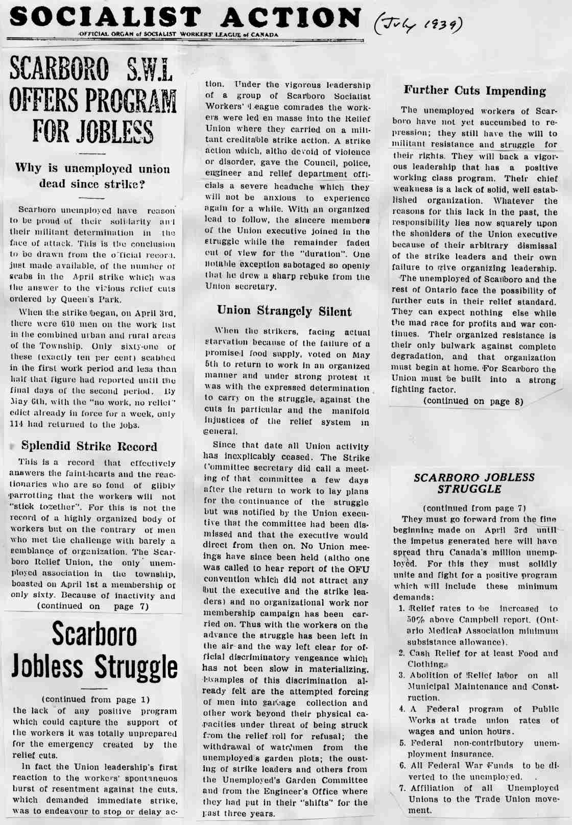 | 1939-05May-1ab | 2000 Relief workers stand firm against cuts (Toronto area SWL militants give lead); Scarboro strike |