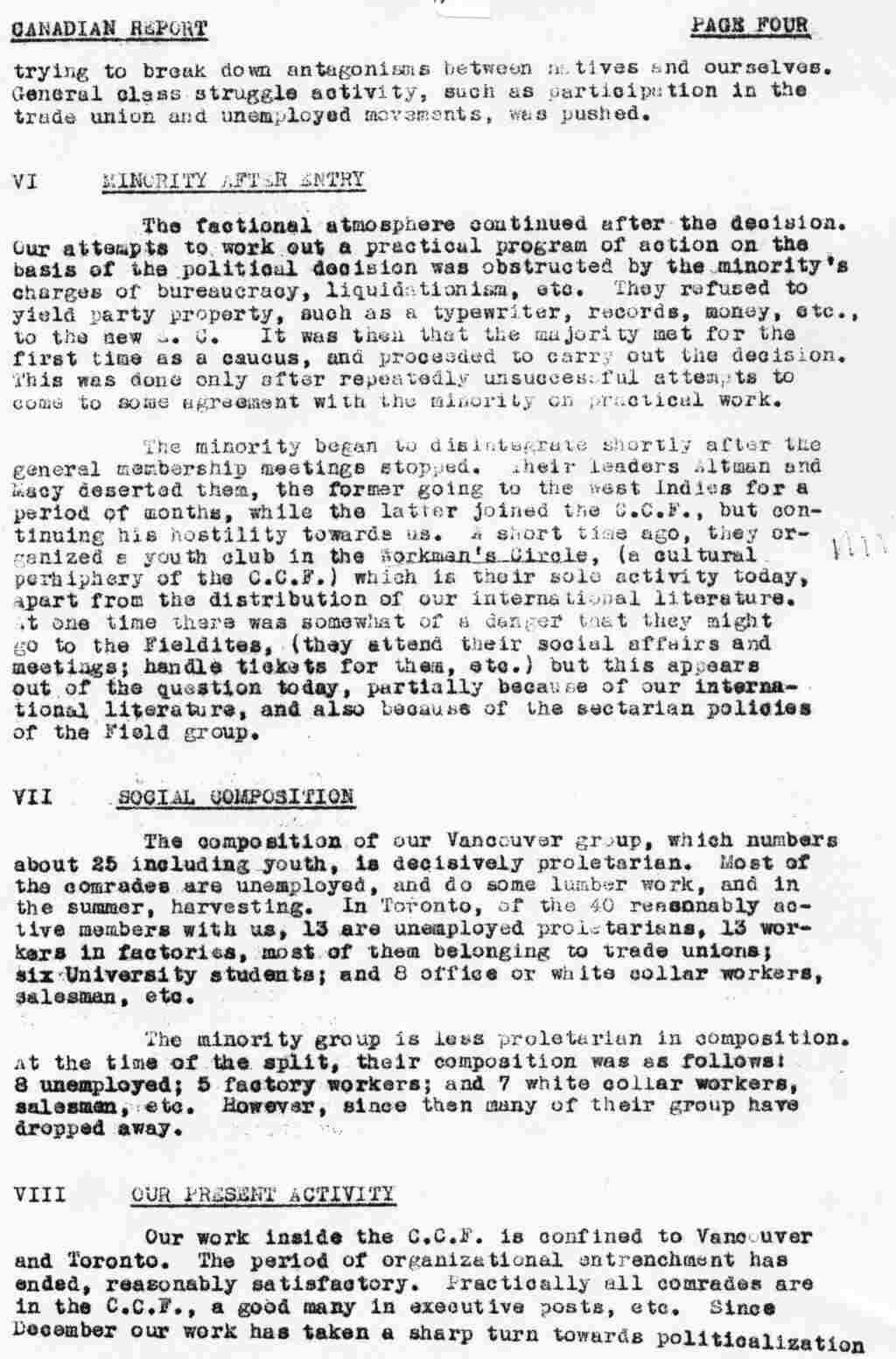 The C.C.F., while outwardly stable, is composed largely of raw and uninitiated elements. While in Ontario its composition is overwhelmingly petty-bourgeois, there is a sufficiently large proletarian core to make our work worthwhile. Movements and splits have developed within its ranks regularly. These have been corrupted, (have) disintegrated and to some extent swallowed up by Stalinism, partly because of our own weakness, and also because of our isolation. We do not look forward to any great gains, but the entry experience will strengthen our movement greatly. Closer ties with the Commission will compensate in some measure for our young and inexperienced leadership.
