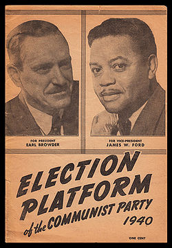 James W. Ford, who ran for vice president on the Communist Party ticket in 1932, ’36 and ’40, was the first African American to run for a presidential ticket in U.S. history. Ford served in the military during WWI; after the war he was an active trade unionist in the American Postal Workers’ Union. In 1925, he became active in the American Negro Labor Congress, a mass organization of black workers founded and led by the Party. The following year, Ford officially joined the CP. Ford quickly became a respected leader in the CP and in 1928 he was sent to the Soviet Union to the 4th World Congress of the Red International of Labor unions. Also in 1928, Ford attended the 6th World Congress of the Communist International, where he served on the Comintern’s Negro Commission, and the 2nd Congress of the League Against Imperialism. In 1930, Ford helped organize the Comintern sponsored 1st International Conference of Negro Workers. In1932, Ford returned to the U.S. where he was elected vice president of the League of Struggle for Negro Rights, and to the Political Bureau of the CPUSA. In 1933, Ford was put in charge of the Party work in Harlem. Again in 1935, Ford was sent to the 7th World Congress of the Communist International, and then as fascism was on the rise, he went to Spain to support the Republican forces in the Spanish Civil War. During the late 1930s, Ford was instrumental in founding the National Negro Congress. After WWII, the dissolution of the Communist Party by Earl Browder, and it’s re-founding, Ford continued to play an active role in the Communist Party, African American rights, peace and socialism. Ford died in 1957.