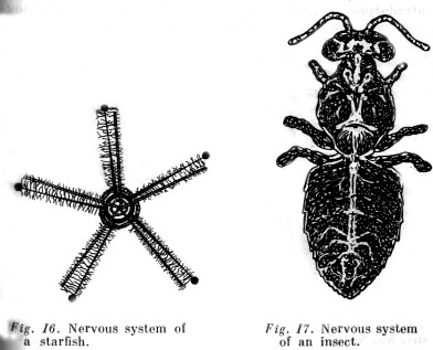 In such a reticular nervous system excitation is diffusely transmitted; the nerve fibres forming the network have two-directional conductivity, and inhibitory processes do not apparently exist. The next step in the evolution of the nerve system is represented in the differentiation of neurons that form central ganglia (nerve junctions). Along one line of evolution (among echinoderms) the nerve ganglia form an apipharangeal ring with nerve columns running off from it. This is already a nerve centre that enables relatively very complexly coordinated movements to be performed, such as a starfish's movements to open the shells of bivalves. Along two other major lines of evolution (from the primitive worms to crustraceans and spiders, and from primitive worms to insects) a more massive anterior... ganglion becomes formed which subordinates the working of lower-lying ganglia to itself (see Figs. 15-17).