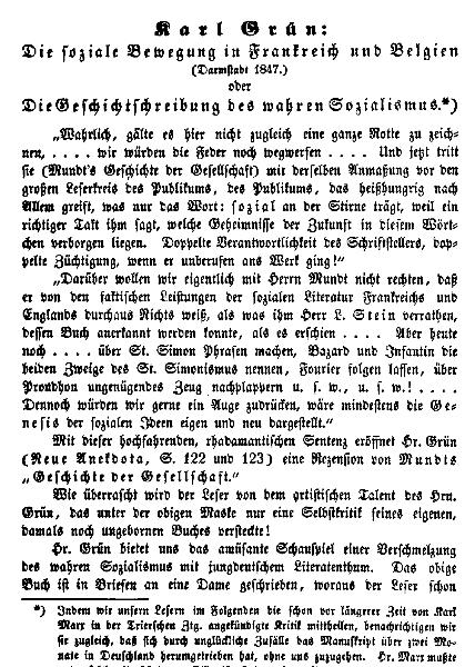 One can see from this that Grün’s fabrication is on a much lower level than the work by Stein, who at least tried to explain the connection between socialist literature and the real development of French society. It need hardly be mentioned that in the book under discussion, as in the Neue Anekdota, Herr Grün adopts a very grand and condescending manner towards his predecessor.