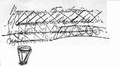 Facsímil del començament d’una proclama, escrita amb llapis per A. I. Konovalov, ministre de comerç i indústria del govern provisional, i després barrada quan es va fer evident el caràcter desesperat de la stuació. La figura geomètrica de sota fou probablement dibuixada desvagadament mentre els ministres esperaven la fi.