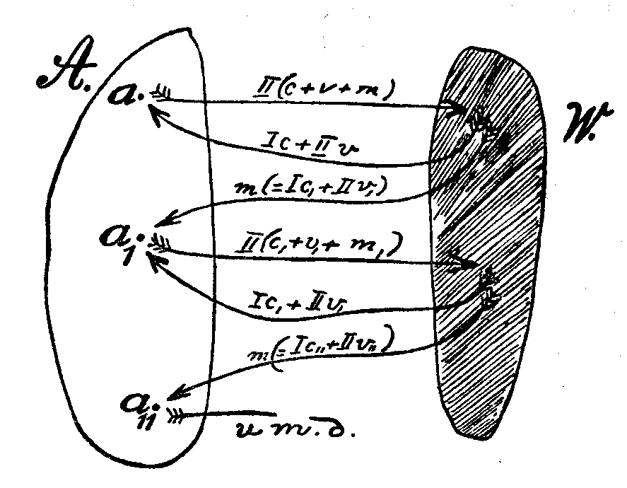 A — kapitalisté; W— bezprostřední výrobci. a, a1, a11 — kapitalistické podniky. Šipky ukazují oběh směňovaných výrobků. c, v, m (= n) — součásti hodnoty výrobků. I, II — naturální forma výrobků: I — výrobní prostředky; II — spotřební prostředky.