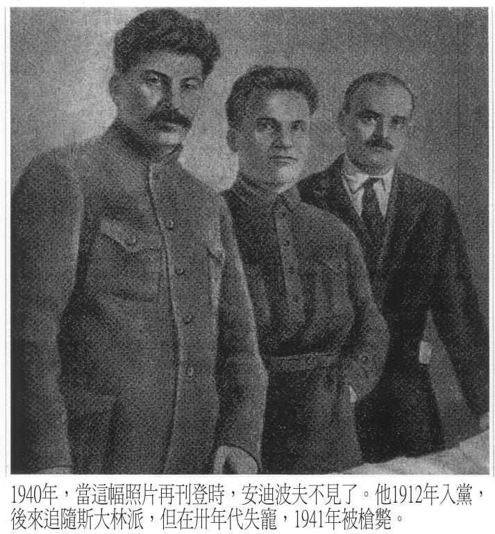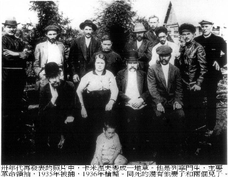 | 中文马克思主义文库 -> 图片馆 -> 【图库】斯大林伪造照相馆 斯大林伪造照相馆 历代的当权者为了巩固其政权,常常会用各种手段捏造及歪曲真实的历史,以达到愚民的效果,方便其统治。这种捏造历史的情况似乎在那些完全不受人民监督,拒绝任何方式的民主政治,却整天自称是代表人民的伪社会主义政权尤其严重。这里要介绍给读者的是一部难得的有关伪造前苏联历史的照片集,整个伪造过程的幕后黑手不是别人,正是在俄国1917年革命退潮中用尽一切阴谋手段去夺得统治权的独裁者史太林。在他掌权期间,不但进行大规模的清洗计划,把知情者及政治上的异己甚至自己的支持者一一从肉体上消灭,同时任意修改保存历史真相的珍贵图片及艺术品,为的是要消灭俄国十月革命的主要领袖(例如托洛茨基)的历史痕迹,同时伪造自己才是主要领袖的记录,为的是创造全国上下对他的个人崇拜。 幸好,历史最终不是按个人的意志行事的,更不容永远被歪曲。经过有心人的搜寻及研究,被埋没几十年的真相终于又再呈现在公众眼前。这本书叫《人民委员突然消失了》(The Commissar Vanishes),副题是史太林时代对照片及艺术的伪造,作者是英国图像历史学者David King。1997年版。 根据作者的介绍,资料的收集工作始于1970他的一次苏联之旅,当时他发现成千上万在史太林政权治下的受害者影像消失了,于是决定找出真相。之后他花了约三十年时间从各种各样的照片、书籍、海报以及印刷品中收集到廿五万份图像,并选出最精彩的部份收录在这图片集里。 读者会从这部精彩的著作中看到,史太林如何利用图片科学的技术来达到他个人的政治目的,把所有不利于巩固他个人权力的历史人物从照片中剔除。他命令官僚用无所不用其极的手段去窜改历史图像。其中包括把照片中的人物用喷漆涂污,删除图片中原有的人物,窜改群众场景等等。本书采用的封面就是其中一幅著名的照片:三名苏共高层干部在不同时期刊登的官方照片中陆续消失,最后只剩下史太林一人!类似的手法在其它地方出现过无数次。他尤其用心去捏造他在革命伊始已是列宁的亲密战友,以及消灭人们对革命第二号领袖人物托洛茨基 (史太林的宿敌,后被史派遣的格别乌杀害) 的记忆,照片中许多领袖人物在史太林手上最后只变成一堆干草,沼泽,耕地,梯级或干脆黑漆一片... 书中所用的部份图片是来自一位出色的前苏联艺术家的个人珍藏,其中有些人物──许多是被史太林认为是异己而遭清洗掉的──的面容都遭深色墨水涂污至难以辨认。