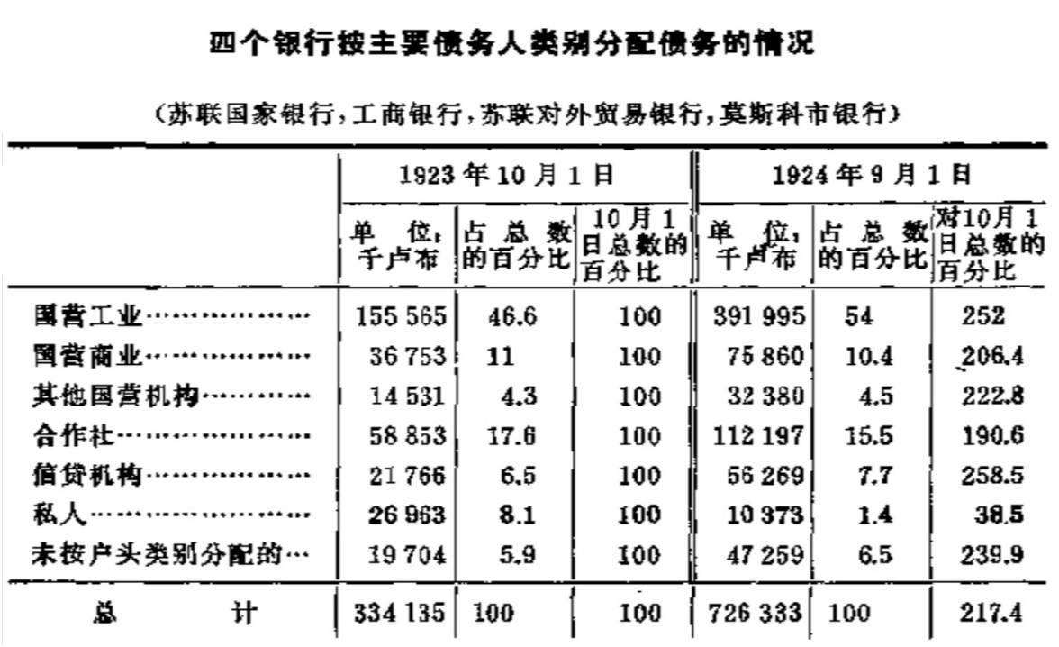 在莫斯科商品交易所的流转额中,私人资本在出售方面的作用从占总流转额的12.2%(1923年10月)降为5.5%(1924年,8 月)。在购买方面的有关数字将是:10月占20%, 1924年8月占10.7%。