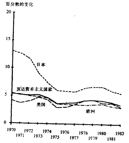 1973年以来积累的下降主要发生在经济繁荣的发源地——日本和欧洲。到1982年时,日本因投资停滞使企业积累率下降到了5.7%,比70年代初期的积累率的一半还低。在欧洲,这一积累率从5.5%下降到了3.1%。在美国,1980年所达到的积累率为4%,这与70年代初的积累率相当。1982年它只下降到3.2%(见图16•l)。