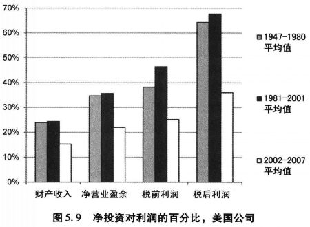 2001年之后下降的原因反倒是公司对利润在最近这场危机前的泡沫年代中的快速上升反应滞后。(这一滞后并不奇怪;重大投资项目常常需要很长的时间去计划和筹备资金。)税后利润在2001(这一年利润率达到一个低点)至2003年期间跳升了35%,但同一时期净投资下降了41%,这是因为公司继续执行着它们在利润率急剧下降时所制定的投资决策——或者不投资的决策。