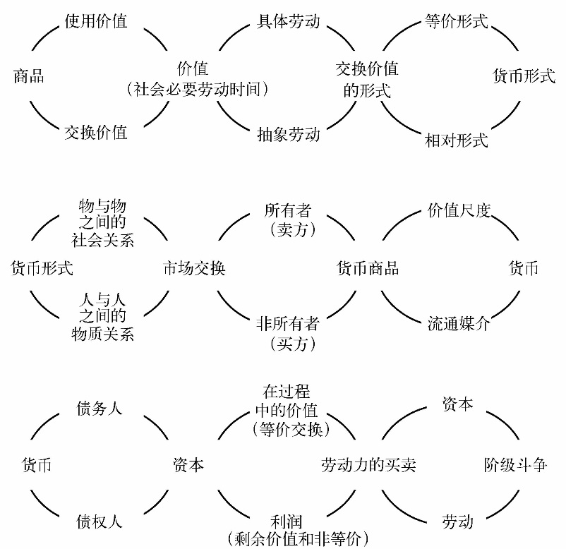 他从单一的商品这一概念开始,在其中嵌入了使用价值和交换价值的二重性。在交换价值背后隐藏的是作为社会必要劳动时间(“社会必要”意味着一些人想要或需要这种使用价值)定义的单一的价值的概念。价值内化了具体劳动和抽象劳动的二重性,使它们通过价值在价值的相对形式和等价形式的二重性中被表示出来,从而在一种交换活动中结合起来。从这一点开始,一种货币商品作为价值的普遍表现而出现。但是,这掩盖了价值作为一种社会关系去生产商品的拜物主义的内在的含义,它被理解为在人与社会之间和与物之间的物质关系。在市场上,人们与其他人之间的相关性,并不是作为人与人而是作为物品的买者与卖者的关系。这里,正如在自由理论中那样,马克思假设了私有财产权、合法的个人和充分发挥作用的市场。在这种环境下,货币作为价值的代表,扮演了两个不同的而且是潜在对立的角色,即作为价值尺度和流通手段。但是,最终只存在一种货币,而且这两种角色之间的对立,看起来被一种新的货币关系所化解,即债务人和债权人之间的关系。这使人们关注的焦点从C-M-C的流通形式,变为M-C-M形式。当然,资本的典型概念并不是作为物被定义的,而是作为能生产一种使用价值(利润)的价值的循环形式而被定义的,即M-C-M+ΔM。这在假设的纯粹市场交换的等价原则与剩余价值生产中所要求的不等价之间,形成了一个矛盾。这一矛盾由于作为商品的劳动力的存在而再次被化解,因为劳动力可以被购买并被出售到市场,而且随后被用来生产价值,这样就可以生产剩余价值。这样,我们最终就获得了在资本和劳动之间的、关于阶级关系的重大概念。