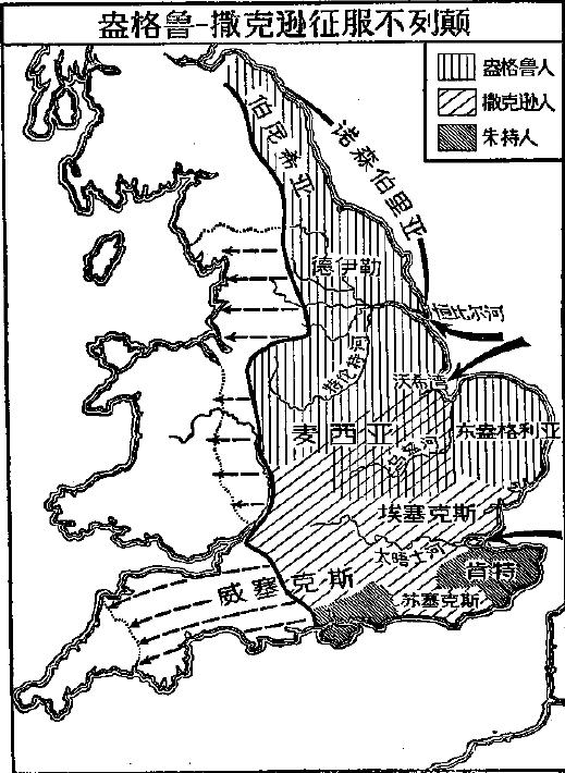 到了这时,英吉利人已定居下来,成为若干小王国,它们的疆界随着无穷的战争的胜败,时而推前,时而退后。罗马的道路网仍未破坏,这些战争,无疑地与最初的侵入无异,也得到这些道路网的便利。这些王国之中有几国的名称仍保存在英国现代的郡名中,另外几个王国则完全消失,连名称也不知道。到第六世纪末年,有七个王国出现[即“七国时代”。——录入者注]。在北方,有诺森伯里亚[Northumbria——录入者注],它的疆土从福思河伸展到恒比尔河。它的两部分,即与约克郡相当的德伊勒和介在提兹河与福思河之间的伯尼希亚,似乎有时分为两国。东盎格利亚王国[East Anglia。——录入者注]占有诺福克、萨福克和一部分的剑桥郡。埃塞克斯王国[Essex。——录入者注]、肯特王国[Kent。——录入者注]和苏塞克斯王国[Sussex。——录入者注]大致与近代同名的郡区相当。威塞克斯王国[Wessex。——录入者注]在太晤士河以南和苏塞克斯以西,西界渐渐伸入萨默塞特。麦西亚王国[Mercia。——录入者注]占有中部各郡的大半,但科茨沃耳德地区是麦西亚王国与威塞克斯王国长期争夺之地。