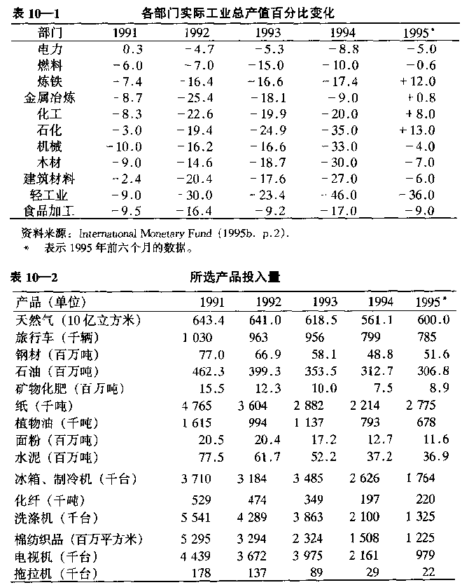 表10—1和图10—2显示了俄罗斯11个工业生产部门的产出情况。如图10—2所示,在1992—1995年实施休克疗法期间,各部门的产量都大幅度地下降了[6],只有电力和燃料部门的下降幅度低于1/3,包括纺织、服装和皮革制品在内的轻工业部门下降幅度最为严重[7],如表10—1所示,在1995年,四个金属和化工部门终于开始增长,而燃料部门差不多也止住了衰退。