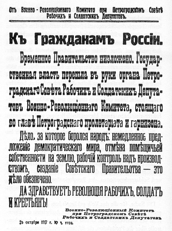Die Provisorische Regierung ist gestürzt. Die Staatsmacht ist in die Hände des Organs des Petrograder Sowjets der Arbeiter- und Soldatendeputierten, des Revolutionären Militärkomitees, übergegangen, das an der Spitze des Petrograder Proletariats und der Petrograder Garnison steht. Die Sache, für die das Volk gekämpft hat: das sofortige Angebot eines demokratischen Friedens, die Aufhebung des Eigentums der Gutsbesitzer an Grund und Boden, die Arbeiterkontrolle über die Produktion, die Bildung einer Sowjetregierung – diese Sache ist gesichert.