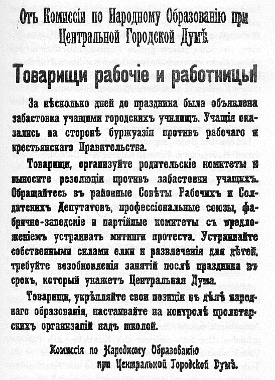 „Die besitzenden Klassen sind gegen die Macht der Sowjets – die Regierung der Arbeiter, Soldaten und Bauern. Ihre Anhänger hindern die Arbeit der Angestellten in der Regierung und der Duma, hetzen zu Streiks in den Banken, sind bemüht, das Funktionieren der Eisenbahnen, der Post und des Telegrafs zu sabotieren ...