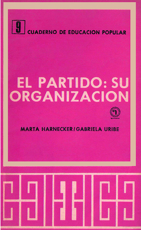 El partido: su organización Autor: Marta Harnecker & Gabriela Uribe Fecha: diciembre 1972 Colección: Cuadernos de Educación Popular. Número 9. Segunda serie: Para luchar por el socialismo. Editorial: Departamento de Ediciones Especiales, División Editorial, Empresa Editora Nacional Quimantú Ltda., Chile |