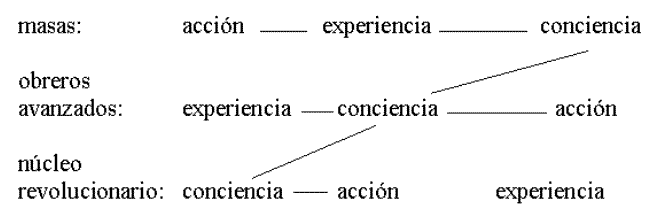 Del esquema mandeliano según el cual las masas, la vanguardia y el partido, recorren diferentes y difíciles caminos para llegar a la conciencia, a la acción o a la experiencia, ya hemos eliminado a la vanguardia, dado que por tratarse de un fenómeno su desarrollo no puede seguir ninguna secuencia previsible. Sólo faltaría agregar que, mientras cumple su papel de vanguardia, cualquier sector sigue en ese momento las mismas leyes de desarrollo que el propio movimiento de masas y el partido, aunque en forma contradictoria. Para los marxistas, "lo espontáneo es la forma embrionaria de lo consciente. Es decir que acción, experiencia y conciencia son partes de una totalidad que se da en todos los niveles, desde el partido hasta las masas. El elemento determinante de esa totalidad son las acciones del movimiento de masas.