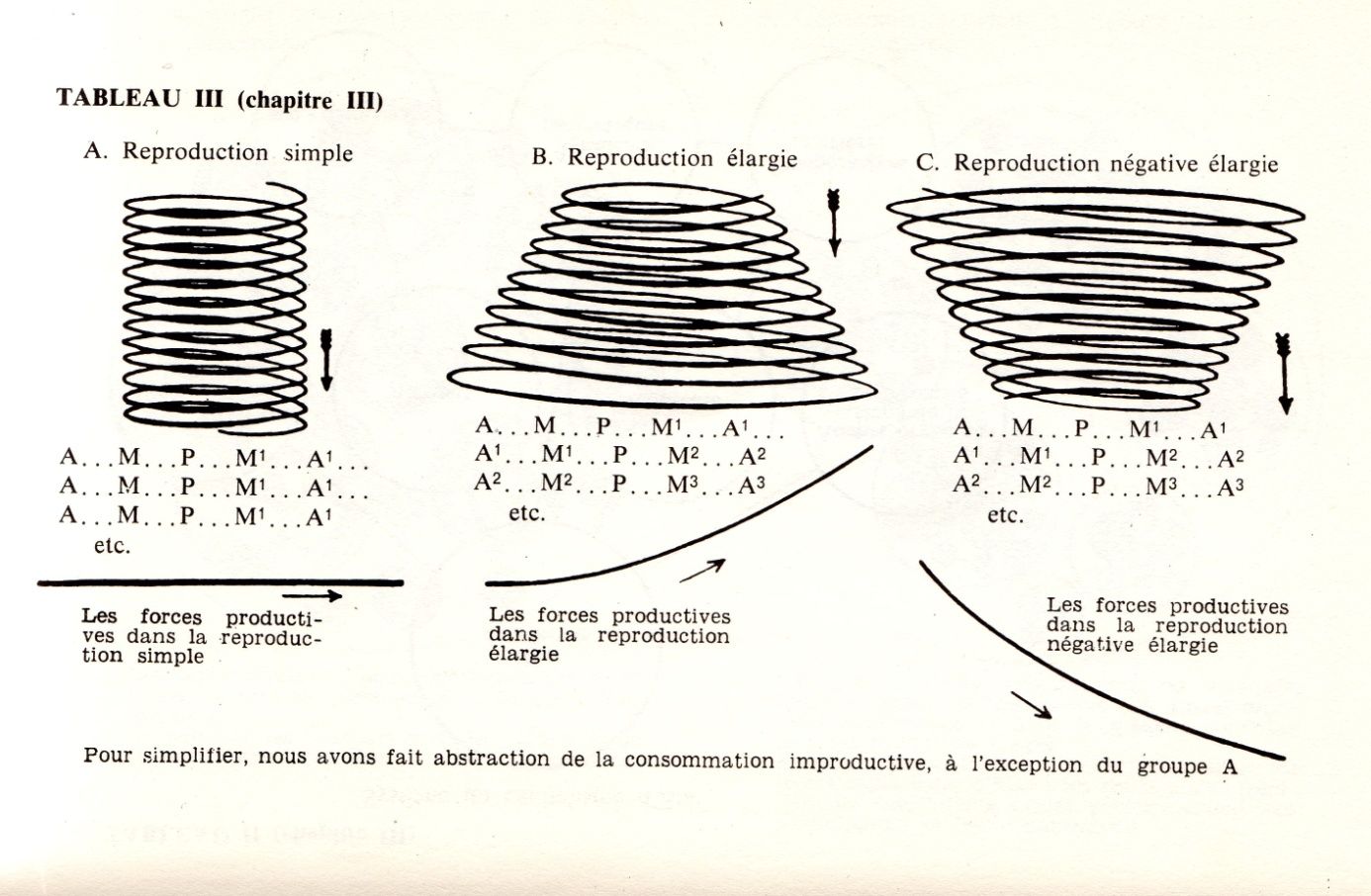 Le processus de reproduction n'est pas seulement un processus de reproduction des éléments matériels de la production, mais aussi un processus de reproduction des rapports de production eux-mêmes [l]. La reproduction élargie est la reproduction élargie des rapports de production donnés : leur champ, leur extension spatiale, deviennent toujours plus grands; la méthode de production donnée «s'étend» en se réorganisant dans ses détails internes; autrement dit, la reproduction des rapports capitalistes de production les reproduit fondamentalement dans la mesure où le rapport entre capital et travail salarié est maintenu et élargi en permanence. Mais à l'intérieur de ce rapport, les détails de la structure de production changent constamment; il suffit de mentionner la croissance de ce que l'on nomme la « nouvelle couche moyenne ». Que se passe-t-il lors de la reproduction élargie négative ? Pour répondre à cette question, il faut s'attarder plus en détail sur le problème de la structure sociale dans son ensemble.