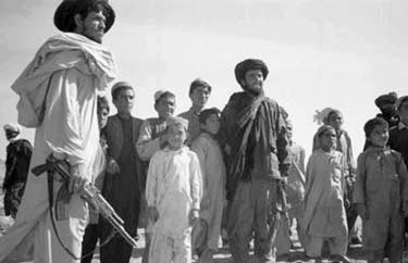 Afghan people fleeing Kandahar arrive at Spinboldak, Afghanistan, 12 kilometers (7.5 miles) from Pakistan-Afghanistan border of Chaman, Nov. 21, 2001. At left is a Taliban soldier. Photo by Mattiullah Achakzai (AP)