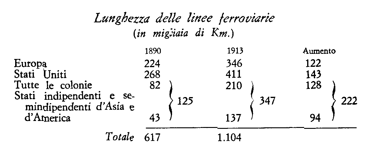 Il più rapido sviluppo capitalistico si verifica nelle colonie e nei paesi transoceanici. Tra essi sorgono nuove potenze imperialistiche (il Giappone). La lotta degli imperialisti mondiali diventa più aspra. Le imprese coloniali e transoceaniche particolarmente redditizie pagano sempre maggiori tributi al capitale finanziario. Nella ripartizione del "bottino" la parte di gran lunga maggiore spetta a paesi che non sempre hanno i primi posti per la rapidità di sviluppo delle forze produttive. La lunghezza delle linee ferroviarie delle maggiori potenze, comprese le loro colonie, ammonta a (migliaia di Km.):