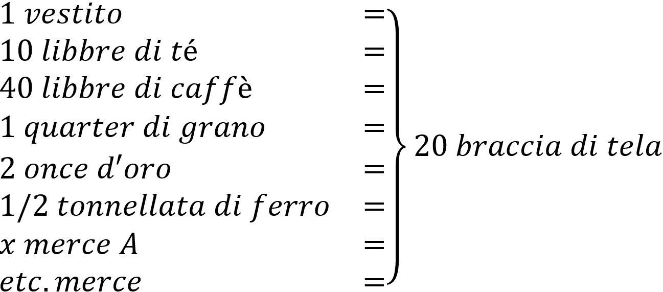 ├ ■(1 vestito&=@10 libbre di té&=@40 libbre di caffè&=@1 quarter di grano&=@2 once d'oro&=@1/2 tonnellata di ferro&=@x merce A &=@etc.merce&=)}20 braccia di tela