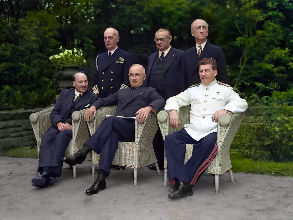 (17 de Julho e 2 de Agosto de 1945): A Conferência de Potsdam ocorreu em Potsdam, Alemanha (perto de Berlim). Os participantes foram os vitoriosos aliados da II Guerra Mundial, que se juntaram para decidir como administrar a Alemanha, que se tinha rendido incondicionalmente nove semanas antes, no dia 8 de Maio. Os objectivos da conferência incluíram igualmente o estabelecimento da ordem pós-guerra, assuntos relacionados com tratados de paz e o contornar os efeitos da guerra. União Soviética: representada por Josef Stalin; Reino Unido: representado por Winston Churchill e posteriormente Clement Attlee e Estados Unidos: representados por Harry Truman.