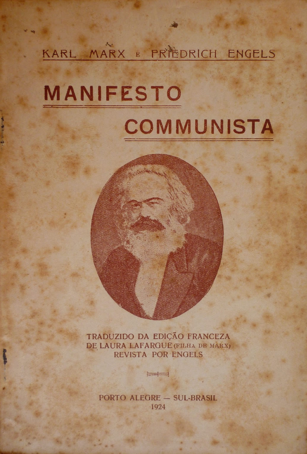 Durante muitos anos, ainda, só quem podia ler textos em francês, em italiano, em alemão ou em espanhol tinha condições para acesso direto ao Manifesto. Até que, em 1923, o ex-anarquista Octavio Brandão, convertido ao movimento comunista, traduziu o Manifesto para o nosso idioma. O texto foi publicado pelo jornal Voz Cosmopolita, a partir do número 38 (correspondente a 1º de dezembro de 1923). O jornal era, como se lia na primeira página, o “órgão dos empregados em hotéis, restaurantes, cafés, bars e annexos”. Em seguida apareceu em forma de livro, impresso em Porto Alegre (1924), com a indicação: “traduzido da edição francesa de Laura Lafargue (filha de Marx), revista por Engels”. Outra tradução seria feita em 1931, por um tradutor anônimo, e lançada em São Paulo pela editora Unitas.