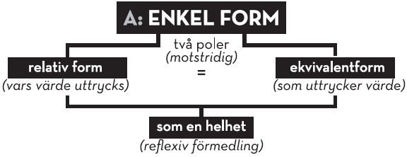 Vara A kallas den relativa värdeformen. A:s värde uttrycks i, och i förhållande till, vara B. Vara B kallas ekvivalentformen, eftersom den fungerar som materiell ekvivalent till värdet av vara A. Vara A får alltså sitt värde uttryckt medan vara B (i dess bemärkelse som kroppsligt bruksvärde) tjänar som den fenomenella form som utgör framträdandet av vara A:s värde. Det är därför bytesvärdet är värdeformen. Det är en manifestation av värde, den form i vilken värde framträder. Det är också därför vi måste kasta om formeln, till yB är värda xA, för att kunna uttrycka B:s värde. Då blir B den relativa värdeformen och A ekvivalentformen.