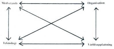 Med detta förbehåll, som skall fördjupas senare, menar jag att alla samhällen kan beskrivas som homeostatiska system, vilkas balans upprätthålls av ett sinnrikt samspel mellan teknologi, medvetande, världsuppfattning och samhällsorganisation (se fig 2).